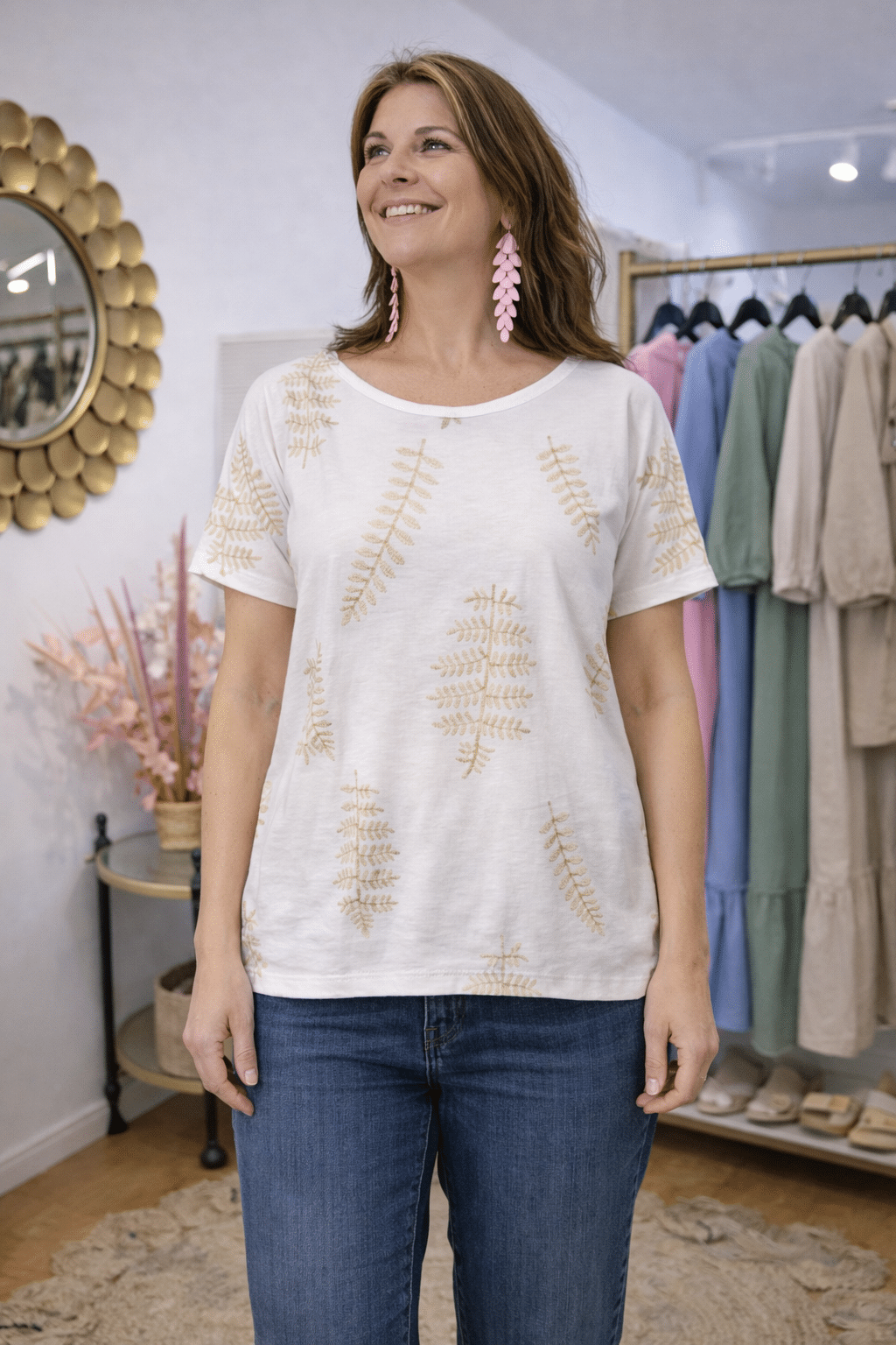 A super nice and easy-to-wear top with a stylish leaf pattern which gives a soft but trendy look 😍 It has a comfortable, relaxed fit and short sleeve – perfect for jeans, shorts or a skirt and just as nice for everyday wear as for summer evenings 💫