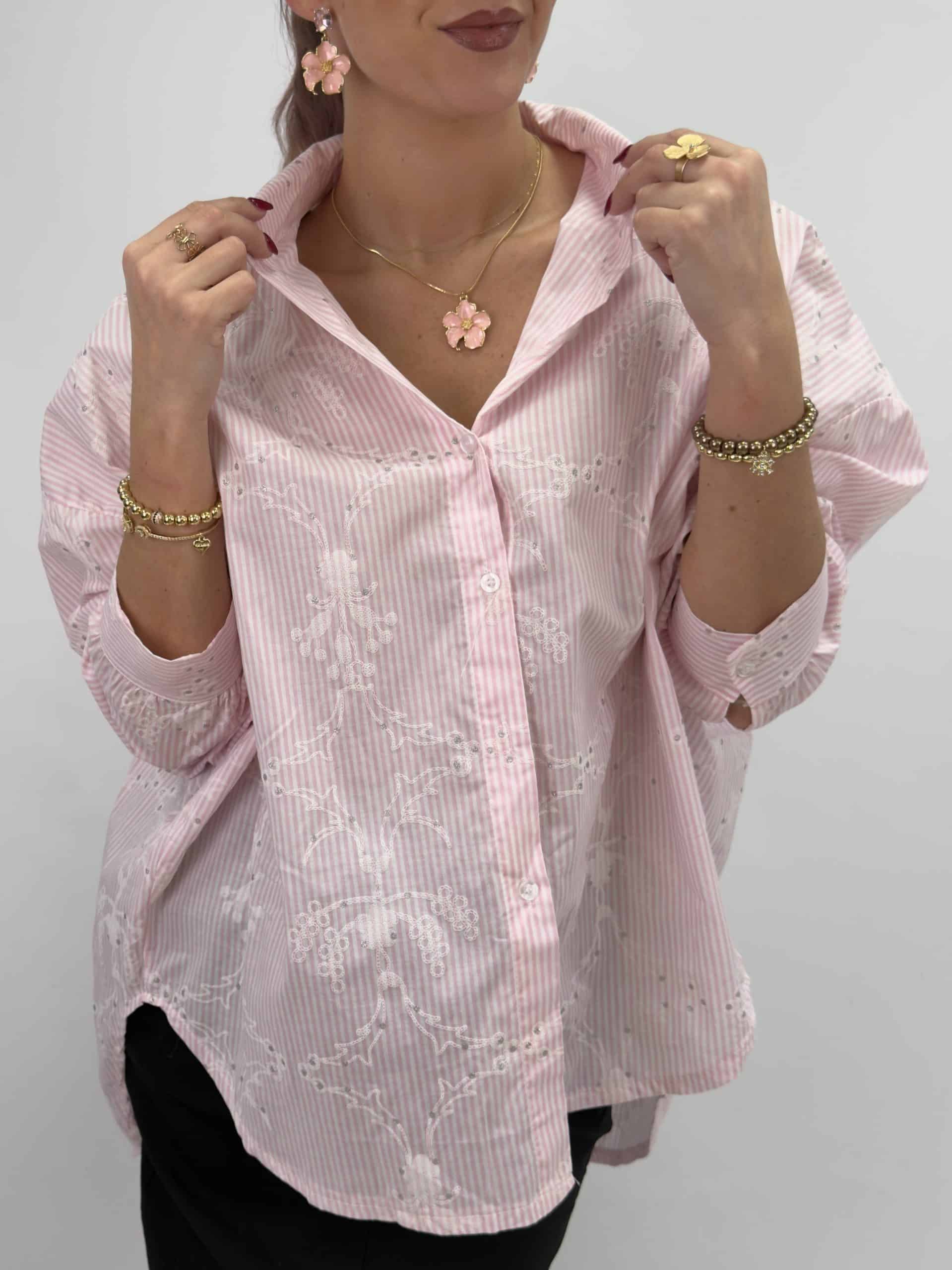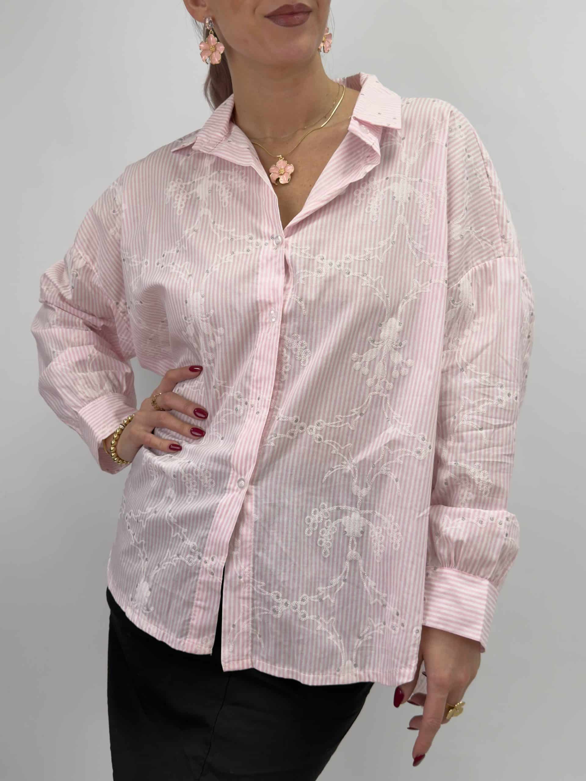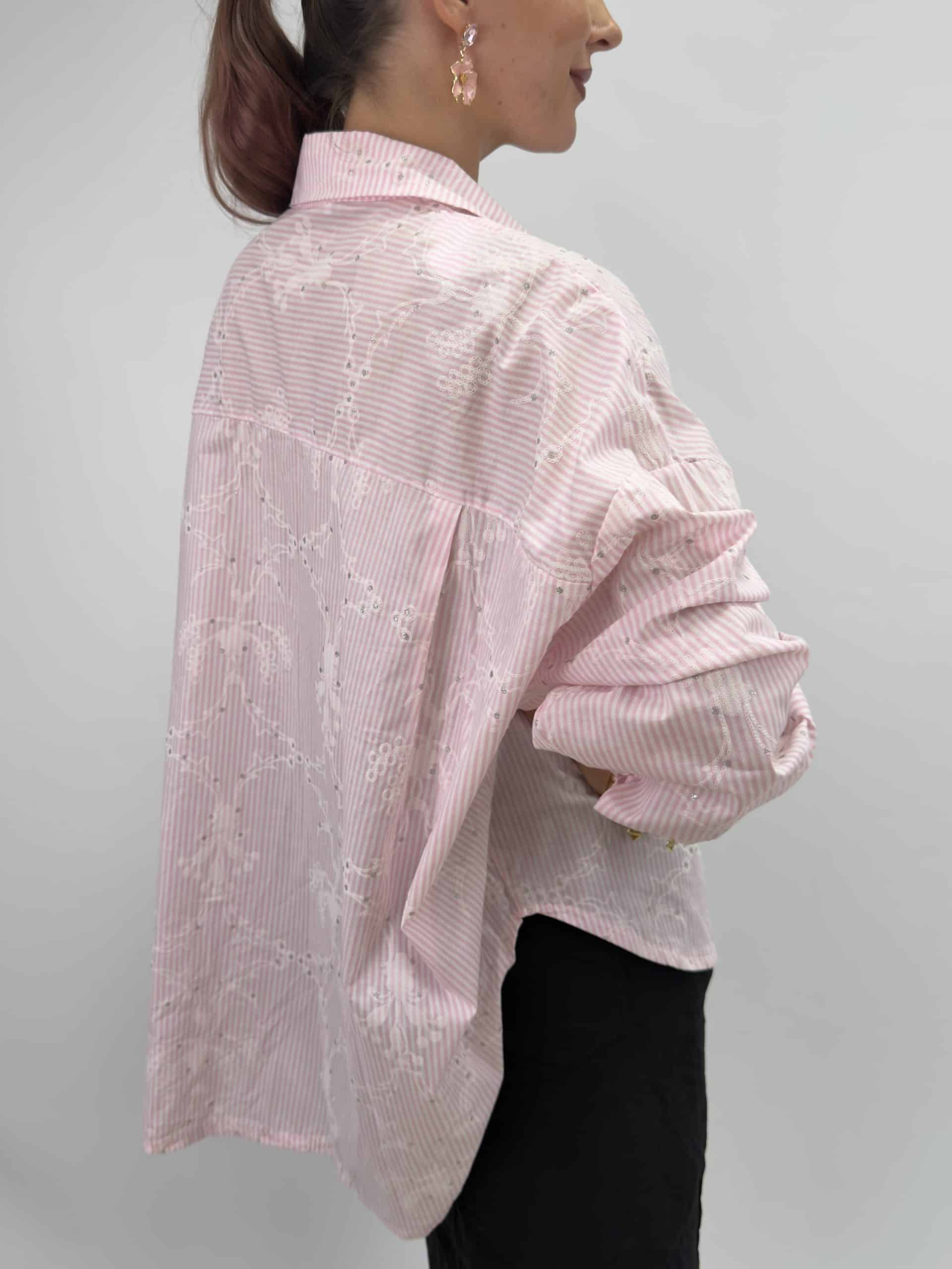 En riktig ögonsten i garderoben! Den här rosa-vita randiga skjortan kombinerar klassiska ränder med vackert broderade mönster som ger en feminin och exklusiv touch ✨