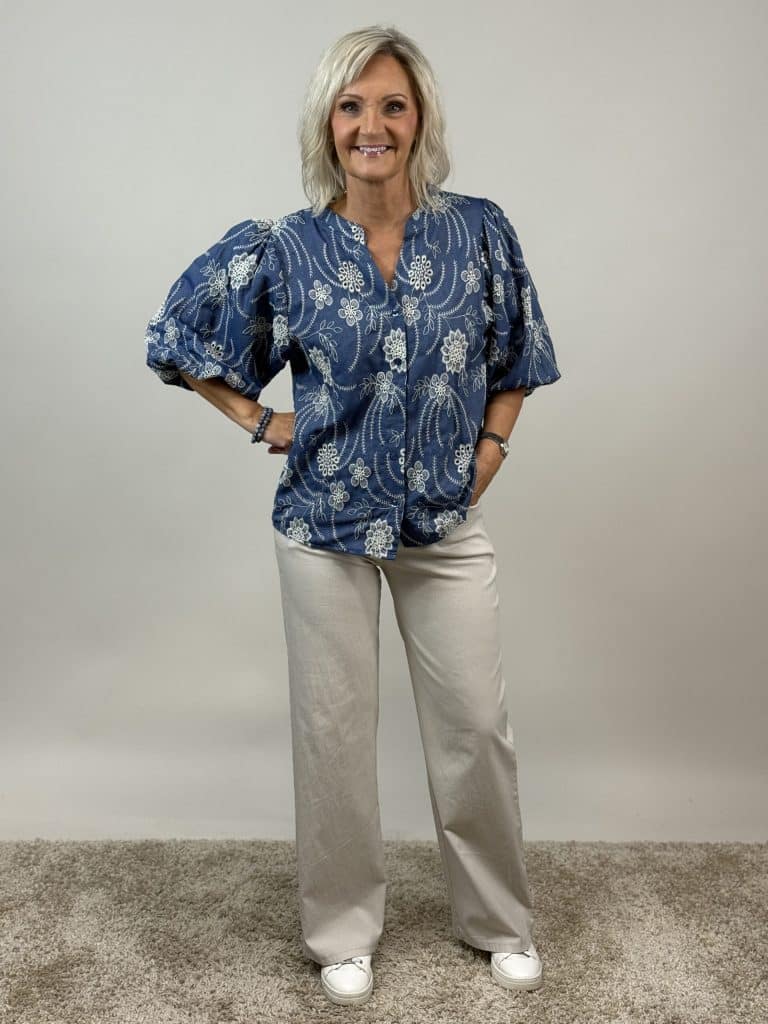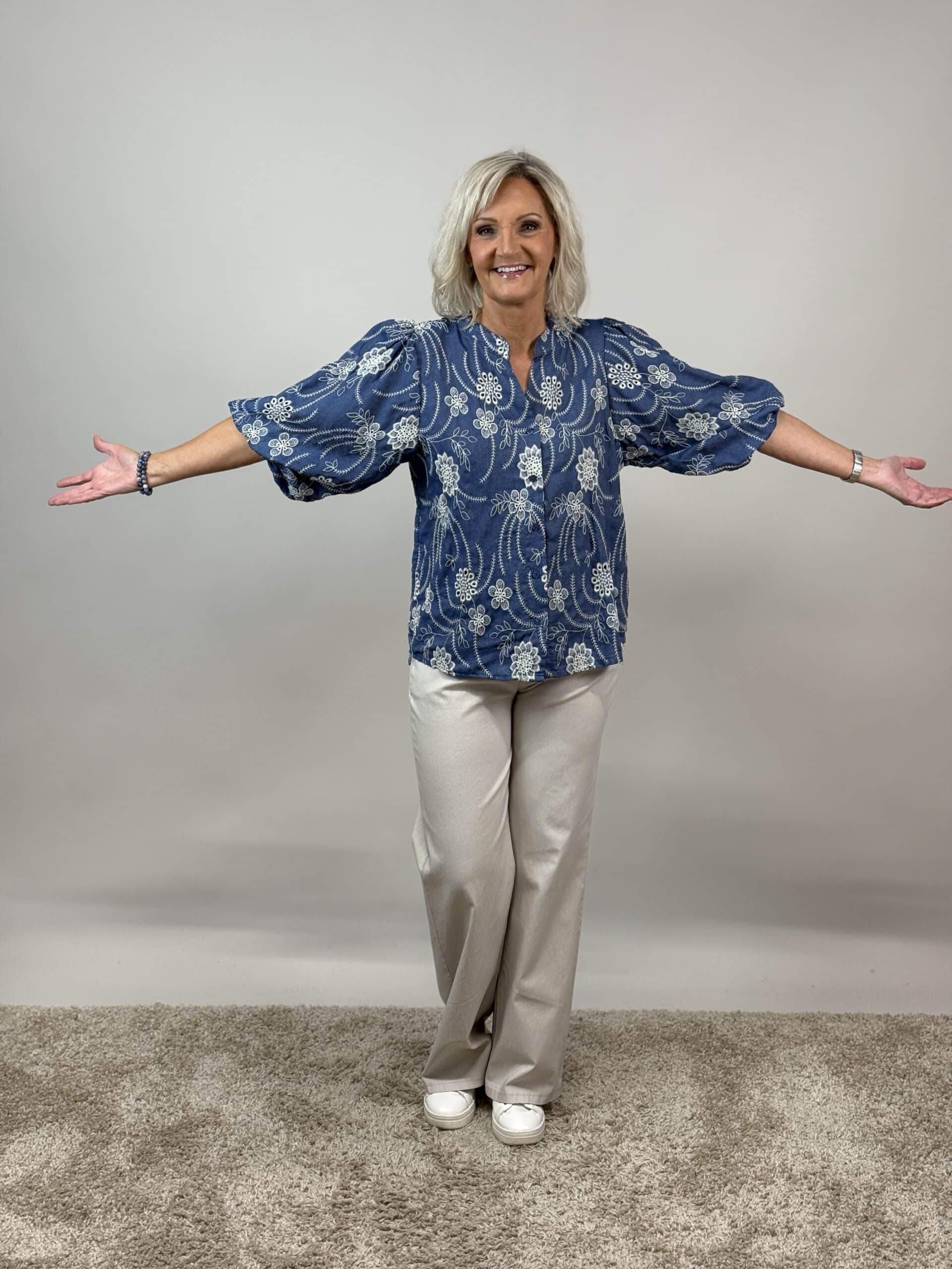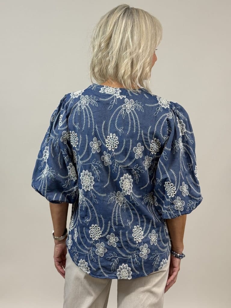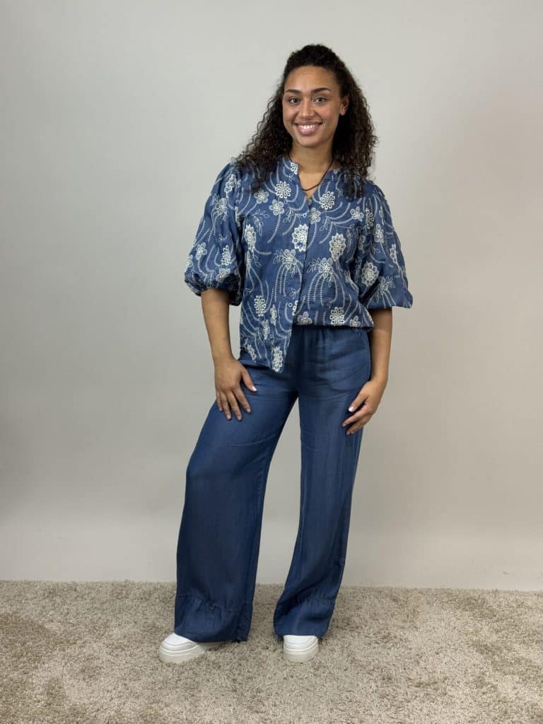 En elegant och feminin blus med vacker blombrodyr som ger plagget ett stilfullt och dekorativt uttryck. Den jeansblå färgen gör blusen lätt att matcha och passar perfekt till både jeans, kjol eller kostymbyxor.