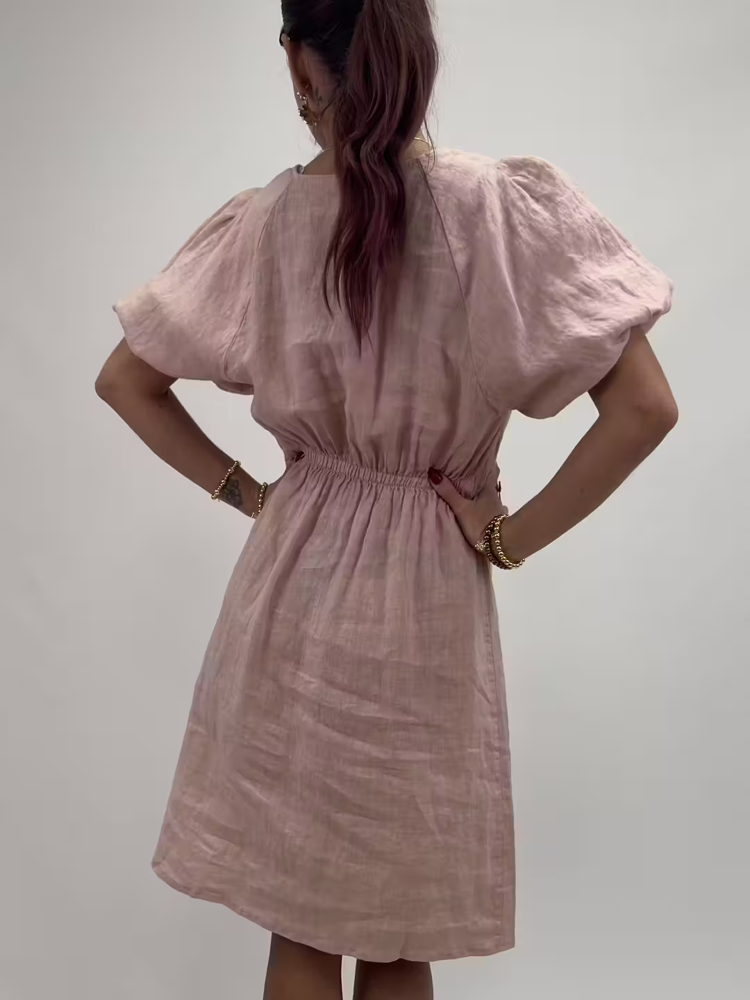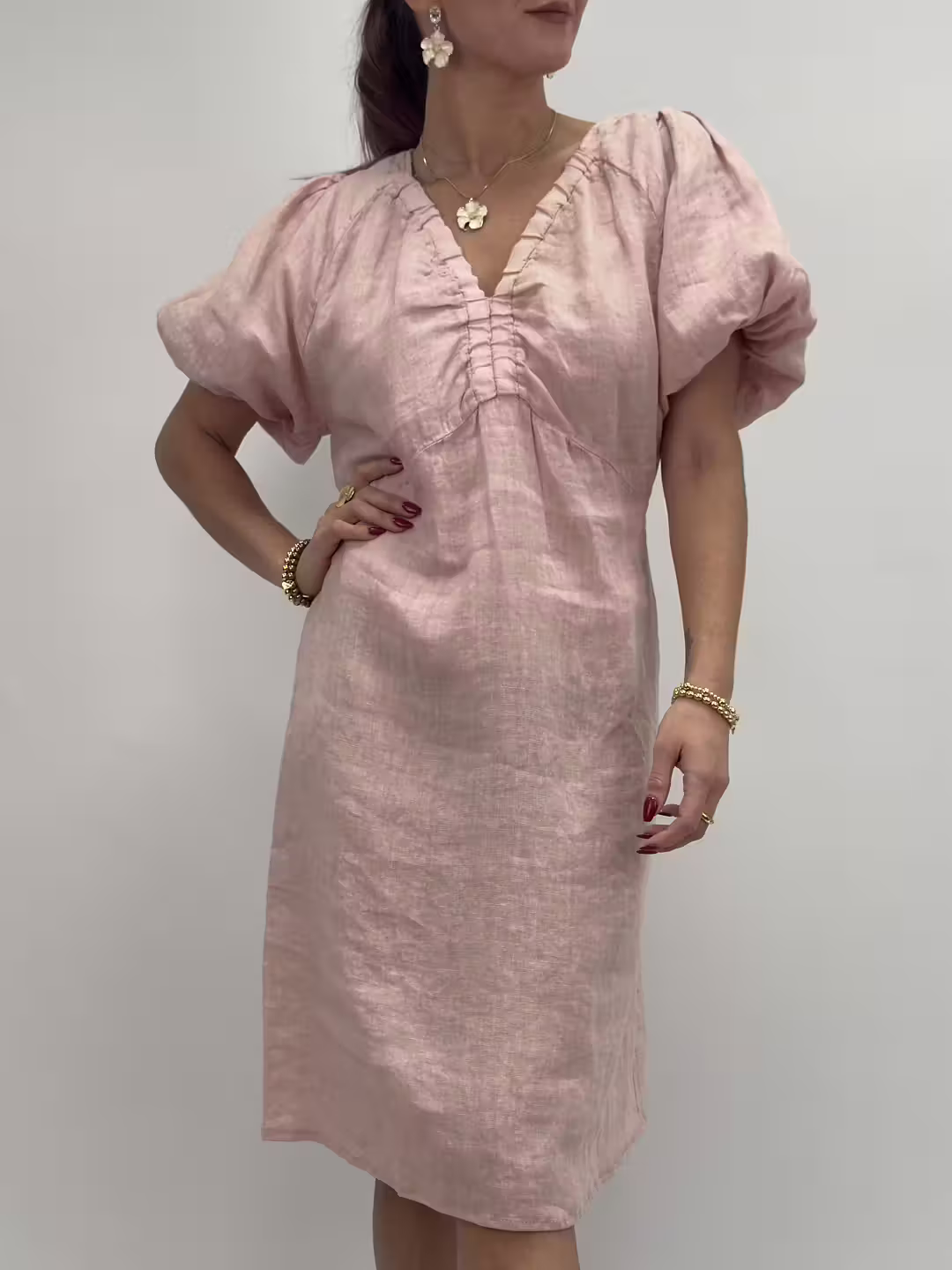 En luftig linneklänning i 100% linne med feminina puffärmar och smickrande v-ringning. Den fina rynkdetaljen framtill ger ett mjukt och elegant uttryck, medan den avslappnade passformen gör klänningen lika bekväm som stilren. Ett tidlöst plagg att bära säsong efter säsong. ✨