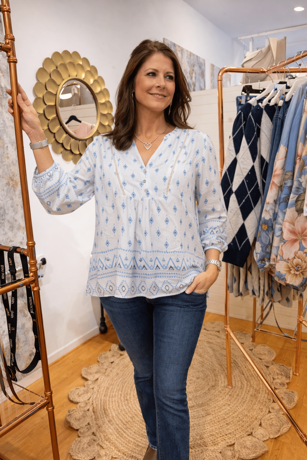 En superfin och luftig blus i 100% viskos med vackert blått mönster som ger en fräsch, somrig känsla 😍 Blusen har en söt volangkant i halsen, en liten V-öppning och knäpps med 3 knappar framtill. Den avslappnade passformen gör den lika fin till jeans som till vita byxor eller shorts 👖☀️
