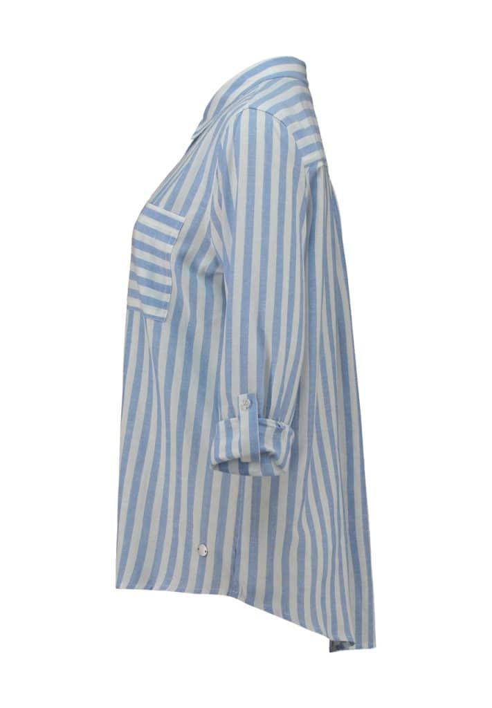 En fräsch och somrig skjorta med blå/vita ränder i en sval blandning av linne och viskos 😍 Skjortan har klassisk skjortkrage, knappar framtill och en praktisk bröstficka. Ärmarna kan rullas upp och fästas med en liten knappflärp för en avslappnad look 👌☀️